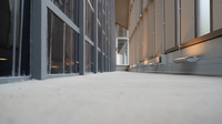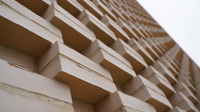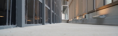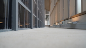 Die neue Außenfassade aus Besenstrich-Glas: Die äußerste der drei Scheiben auf der Außenseite hat eine Besenstrichstruktur. Sie verhindert, dass ein spiegelnder, quasi entmaterialisierter Bau entsteht.