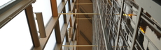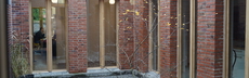 Die Außenwand mit Bleiverglasungen blieb komplett erhalten. Davor entstand eine neue Glaswand als Holz-Pfosten-Riegel-Konstruktion mit Dreifachverglasung.