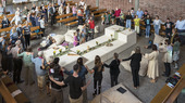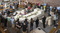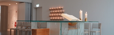 Der Altar "setzt" sich, auch durch seine helle Farbe, ins Zentrum der Kirche. Traditionelle Prinzipalstücke rücken in den Hintergrund. Der Fokus auf den immer wieder anders arrangierten Altar, der zugleich auch Bühnenbild ist, hat die Liturgie näher an und in die versammelte Gemeinde gebracht.