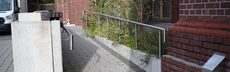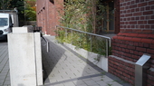 Die Gestaltung der Außenräume mit einer Bank, die den Raum für die Rampe bildet, ...