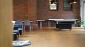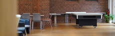 Das Foyer, von der Außenwand des Kirchenbaus geprägt,