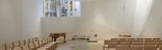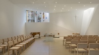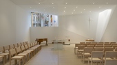Im Inneren setzt sich die disziplinierte Architektursprache fort, die mit wenigen aber präzise gefügten Materialwechseln auskommt. Der Kirchenraum wirkt im Inneren als besonderer Raum innerhalb des Ensembles.