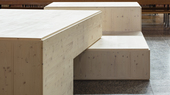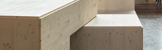 Helles, unbhandeltes Holz: Der Spiel.Raum.Altar besteht aus gleichen L-förmigen Körpern. Er war ursprünglich nur für eine begrenzte Einsatzzeit konzipiert. Aufgrund der hervorragenden Akzeptanz und intensiver vielfältiger Nutzung wird er in der Kirche bleiben.