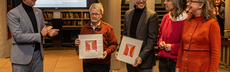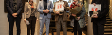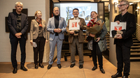 Die glücklichen Gewiner*innen in der Kategorie Kirche: Architekt Joel Harris (v.r.n.l.), Pfarrerin Susanne Zimmermann Baukirchmeister Johannes Feyrer von der Erlöserkirche in Köln-Weidenpesch mit Dr. Thorsten Latzel, Präses der Evangelischen Kirchen im Rheinland, Gudrun Gotthardt, Leitende Landeskirchenbaudirektorin und Architekt Prof. Achim Pfeiffer, Mitglied der Jury.