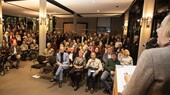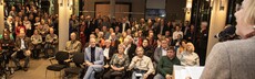 Volles Haus im Landeskirchenamt in Düsseldorf. Viele waren am 24. November 2023 zur Preisverleihung gekommen. Gudrun Gotthardt (rechts), Leitende Landeskirchenbaudirektorin, stellte alle Bauprojekte vor, die in die engere Wahl gekpmmen waren.