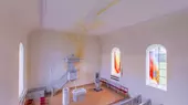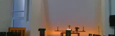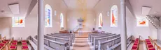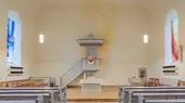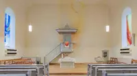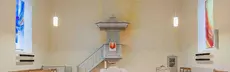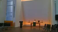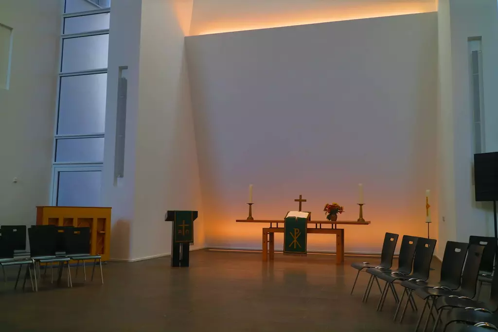 Die Kirche öffnet sich zum Foyer des Gemeindezentrums und bietet die Möglichkeit, den Kirchraum bei größeren Gottesdiensten zu erweitern. Dafür wurden in die Außenwand drei Türen eingebaut, die in das neue Foyer führen.