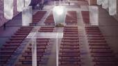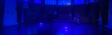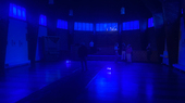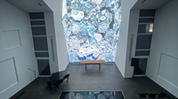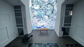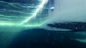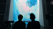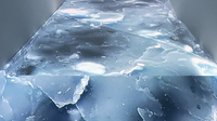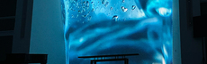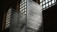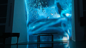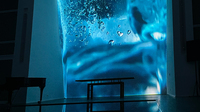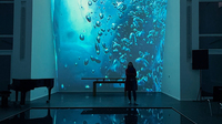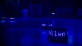 Wasser. Aus seiner Atemluft werden skulpturale Formen, in denen sich die Umgebung reflektiert. Sie steigen langsam hinauf und werden schließlich von der Eisdecke eingeschlossen. Plötzlich dringen Geräusche aus der Unterwasserwelt ins Ohr: Atemzüge werden laut, Atempausen werden leise. Währenddessen spiegeln sich Wände und Deckengewölbe der Kirche majestätisch in einem Wasserbassin auf dem Boden. Sie verschmelzen mit dem Video auf der Wasseroberfläche.