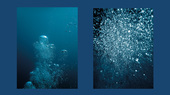 Aus einer Tauchflasche werden Luftbläschen in eine Wassersäule geleitet. Auch sie steigen empor und bilden skulpturale Formen, die sich stetig verändern, bis sie die Wasseroberfläche erreichen. Abtauchen oder auftauchen, Luft holen und weitergehen oder innehalten und loslassen: Für die Besuchenden wird das Erleben von Wasser und Luft zu einem meditativen Vorgang, bei dem sie selbst entscheiden, wie sehr sie sich auf die Naturgewalten einlassen.