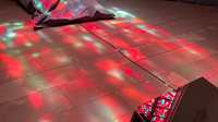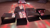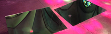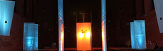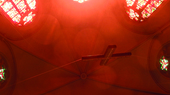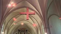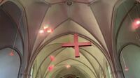 Dorothee Bielfeld fängt diesen Augenblick in ihrer Installation „Erleuchtung“ ein: Mit sechzehn Spiegelobjekten holt sie den roten Lichtertanz weit in den Kirchenraum hinein und gestaltet ihn zu einer Begegnung mit etwas Überirdischem. Einem meditativen Atemzug gleich, erleben Besucherinnen und Besucher das Lichtspiel, wenn sie um und durch diese Installation schreiten. Die unterschiedlich ausgerichteten Spiegelflächen setzen die Architektur des Raumes zu einer optischen Kollage zusammen. Es ergeben sich dabei bisher unbekannte Blickwinkel, das Altbekannte erscheint im neuen Licht. Auch Ungewohntes wird erfahren: Mit dem Altarraum kann das sakrale Herzstück der Kirche betreten werden, durch das Licht wird er zur Bühne und die Besucherinnen und Besucher zum Resonanzraum für den Heiligen Geist.